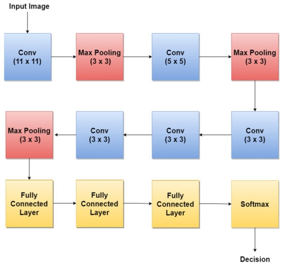 AlexNet [93] is one of the first CNNs widely used in SL classification tasks via TL. The basic architecture (Figure 9) is composed of eight layers, out of which five are convolutional layers (Conv) and three are fully connected layers (FC). The first and second layers are followed by Max Pooling layers (MPX) and Local Response Normalization (LRN), while the third, fourth, and fifth are followed by ReLU (Rectified Linear Units) [94]. The last layer (Softmax layer) has 1000 neurons and is used for the classification task (1000 classes). The number of layers specified in the above architecture is not what makes AlexNet special. AlexNet replaced the Tanh function with ReLU for speed enhancement in terms of training time. In Figure 9, at each layer, the number of neurons is specified.