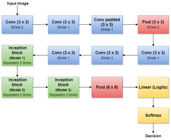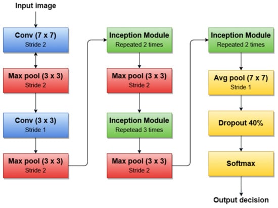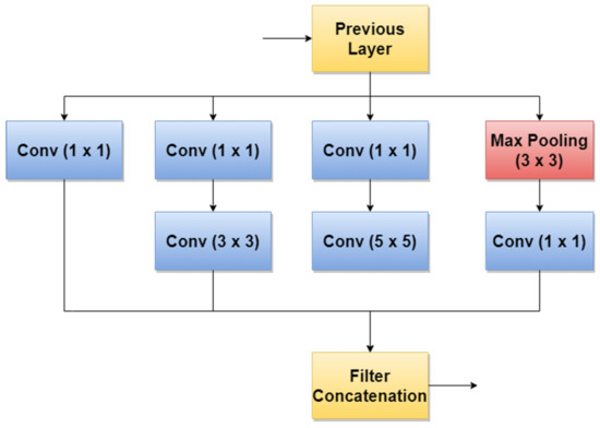 GoogLeNet, also named Inception v1, is a CNN proposed by researchers at Google in 2014 [95]. Its architecture was the winner of the ILSVRC 2014 image classification challenge (ImageNet Large Scale Visual Recognition Challenge 2014) and performed better in terms of error rate compared with previous winners: AlexNet in 2012 and ZG-Net in 2013. New features of GoogLeNet are the following: 1 × 1 convolution, global average pooling, an Inception module, and an auxiliary classifier for training. The 1 × 1 convolution blocks were introduced to decrease the number of parameters in general (weights and biases), which of course led to a depth increase of the architecture. The network’s basic block is the Inception module, where 1 × 1, 3 × 3, 5 × 5 convolutions, and 3 × 3 Max Pooling blocks perform in parallel. The outputs of these blocks are concatenated and fed to the next layer. The Inception module was introduced since different convolutions blocks of different sizes handle objects better at multiple scales. Figure 10 illustrates the components of the Inception module used in GoogLeNet.