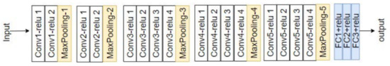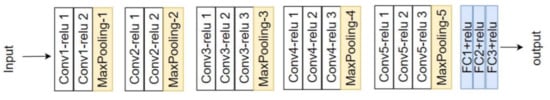 VGG is a NN family with the first representative VGG 16, which is widely used in SL diagnosis. VGG16 [98] is slightly similar to, but larger, than AlexNet, being 16 layers deep and containing only small 3 × 3 convolution filters (Figure 13). For instance, the authors in [45,47,53] used a TL technique to train VGG 16 to achieve SL diagnosis.