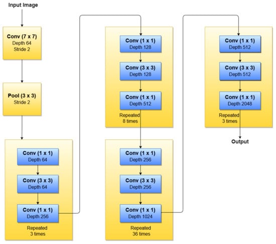 According to our search related to SLs diagnosis (Table 3), in terms of the ResNet family, the most used NNs for detection, segmentation, and classification task, are ResNet-34, ResNet-50, ResNet-101, and ResNet-152. As can be seen in Figure 16, ResNet-152 is a 152-layer-deep CNN composed of residual blocks which solve the vanishing gradient issue when training deep NNs. An example of an SL diagnosis paper that uses ResNet-34 is [47]. Another residual network used in SL diagnosis tasks is ResNet-50 (50 layers deep), which was used for instance in [41,43,47,50], all published in 2020. A residual network 101 layers deep, used in SL diagnosis, is ResNet-101 ([5,42,43,50], all published in 2020). Of course, there are also other studies, such as [38,39,48,96], that use a deeper “residual” network (representing the trend of using more deeper networks for better ACC) called ResNet-152 (152 layers deep).