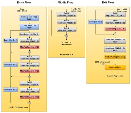 Xception is another CNN used in SL diagnosis tasks. For instance, new related papers are [42,43], both being published in 2020. According to [103], this network was inspired by GoogLeNet Inception NN also developed by Google researchers and was meant to obtain better performance by replacing the standard Inception modules with depthwise separable convolutions. The Xception architecture (Figure 18), which outperforms Inception v3, contains 36 convolutional layers structured in 14 modules, all with residual connections around them [104].