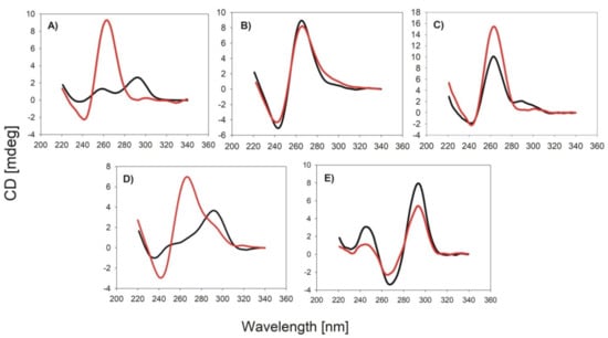 CD spectra of G4-hem conjugates (red) and G4 oligonucleotides (black) for PS2.M (A), CatG4 (B), AGRO100 (C), HT22 (D) and TBA (E). Conditions: 2 µM DNA, 100 mM KCl, 10 mM Tris-HCl (pH = 8.0).