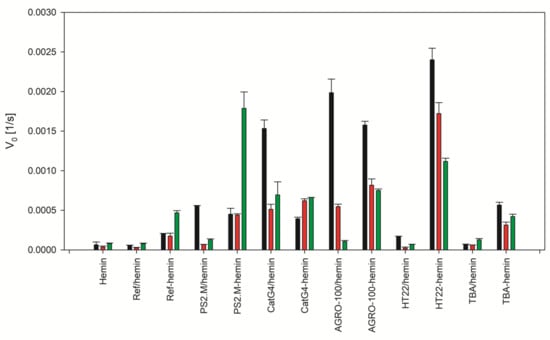 Initial velocity of ABTS per oxidation by hemin, DNA/hemin complexes and DNA-hemin conjugates in various cationic conditions: 100 mM KCl (black), 100 mM NaCl (red), without cations (green).