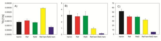 Initial velocity of substrates oxidation by reference oligonucleotides Ref and Ref2 in complex with hemin and DNA-hemin conjugates in comparison to hemin: (A) ABTS, (B) MNBDH, and (C) Amplex Red.