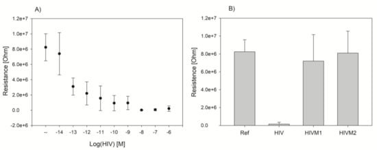 Concentration dependence of resistance measured on the electric chip for HIV DNA target sequence (A), selectivity of the method demonstrated on target DNA sequences with one (HIVM1) or two mismatches (HIVM2); samples were at 1 µM concentration (B).
