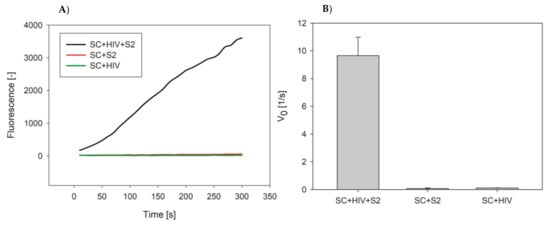 Kinetic plots for resorufin fluorescence generated from the Amplex Red oxidation reaction catalyzed by DNAzyme with covalently attached hemin molecule in a “sandwich” assay for detection of HIV DNA sequence (A) and initial velocity for the reaction with HIV DNA and negative probes (B). Conditions: 5 µM SC, 50 nM HIV DNA, 1 µM S2, 100 mM KCl, 10 mM Tris-HCl, 0.05% Tween 20, 1 µM Amplex Red, 1 mM H2O2.
