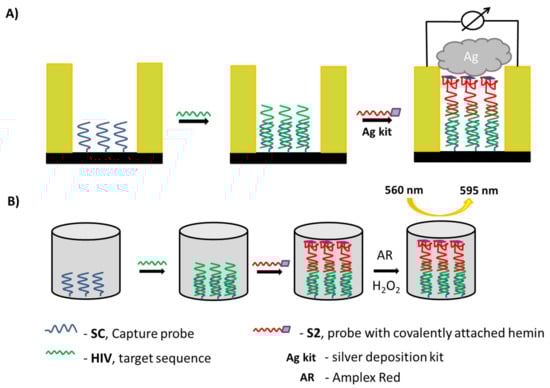 Scheme of HIV DNA sequence detection using electric chip, hybridization with a “sandwich” approach, and silver deposition catalyzed by the covalent DNAzyme (A) and scheme of HIV DNA detection using “sandwich” covalent DNAzyme assay using streptavidin-modified microplates (B).