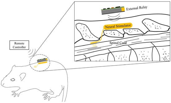 The spinal cord stimulator system consists of an implanted neural stimulator and two external devices: a skin attached external relay and a remote controller (Figure 1). Stimulation protocols are preset at the controller and delivered to the external relay via Zigbee communication [34]. Then, the external relay transfers received stimulation protocols and power to the implanted neural stimulator via an inductive link. The neural stimulator consisting of an electrode array, a receiver coil, and an application-specific integrated circuit (ASIC) circuitries generating biphasic current pulses were implemented and monolithically packaged using a flexible LCP layer. The neural stimulator located outside of the vertebra generates electrical stimulation pulses and send them to the microfabricated electrodes implanted at the epidural part of the spinal cord to stimulate target neurons (Figure 1).