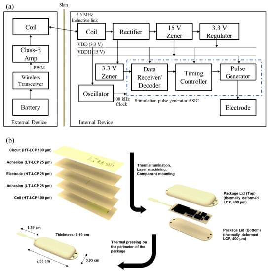 (a) A block diagram of the neural stimulator and the external relay. The internal device receives power and data from the external relay through 2.5 MHz inductive link to generate a biphasic pulse. (b) Fabrication process of the designed neural stimulator. Microfabricated electrode/circuit layers are thermally laminated, laser machined, and electrical components are mounted before being packaged with customized LCP (liquid crystal polymer) lids. HT-LCP: high melting temperature LCP, LT-LCP: low melting temperature LCP.