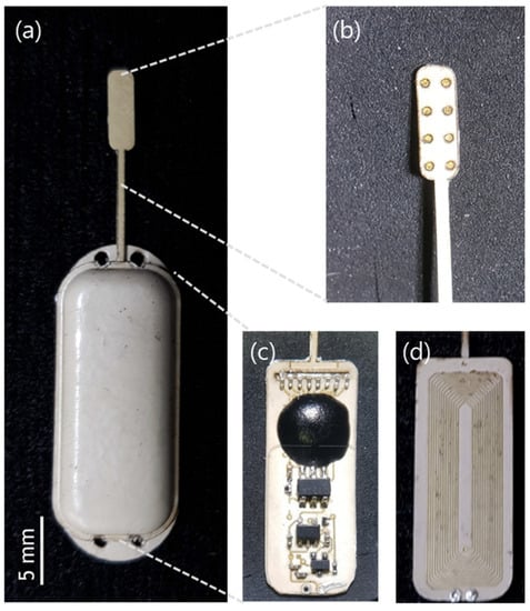 (a) Fabricated implantable neural stimulator; (b) Electrode part; (c) Circuit layer; and (d) coil layer in the package.