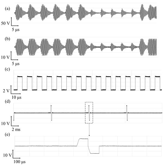 Exemplar waveform of the wireless operation of spinal cord stimulator and its stimulation current pulse generation. The voltage measured across the (a) the transmitter coil and (b) the receiver coil; the output voltage at the (c) oscillator; and (d,e) stimulation generator ASIC.