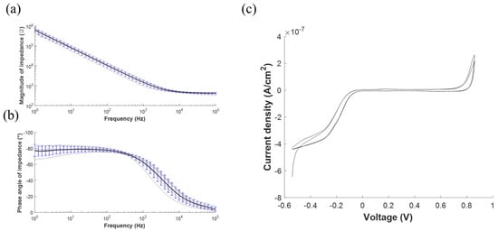 Electrochemical characterization of the stimulation electrodes array. (a) Electrochemical impedance spectroscopy (EIS) measurements as represented by the mean (black line) and the standard deviation (blue bar) of the (a) magnitude and the (b) phase angle of the impedance. The typical (c) cyclic voltammetry (CV).