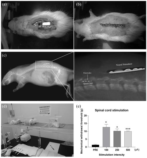 (a) Surgical implantation of a neural stimulator in the rat model of neuropathic pain. (b) Photograph of the rat after surgery, and (c) confirmation of implantation using X-ray images. (d) Experimental setup for Von Frey test to determine thresholds of the flexion withdrawal reflex in response to mechanical stimulation of the left hind limb. (e) Verification of the spinal cord stimulation effect. Measured mechanical withdrawal threshold according to the stimulation intensity (* p < 0.05, *** p < 0.005).