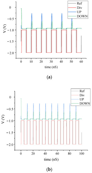The simulation results of PFD: (a) the result of dead time; (b) the result of the maximum operating frequency.
