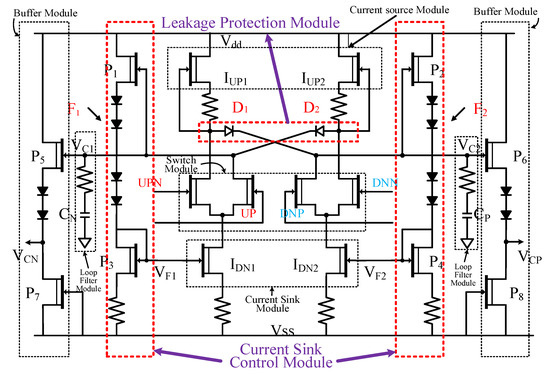 The charge pump (CP) is the core module of a PLL, and the bridge of digital signal and analog signal conversion [19]. A compound CP based on traditional structure is difficult to achieve in a steady state. In this paper, an innovative current sink control and leakage protection in steady-state technologies are proposed. The structure of the differential CP with a loop filter is shown in Figure 4.