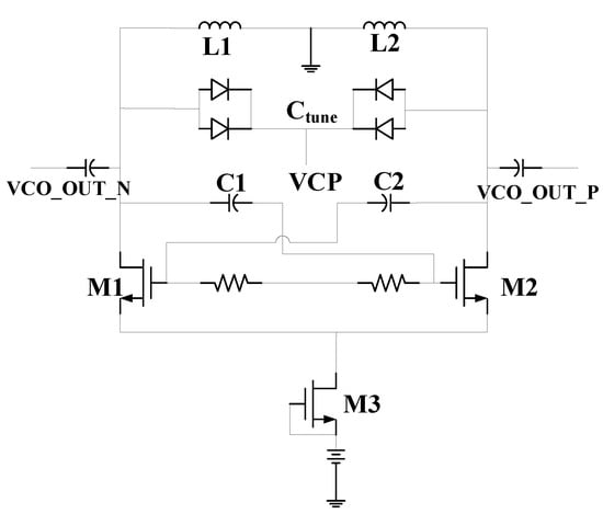 The voltage-controlled oscillator (VCO) is a circuit in the PLL that produces frequency changes through the voltage control. The phase noise and frequency tuning range are the two most important performance factors of the VCO [20,21]. In this paper, the cross-coupling structure VCO is adopted. The structure of the VCO is shown in Figure 6.