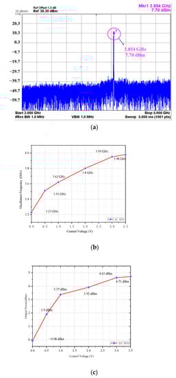 The measurement results of the VCO are shown in Figure 7. The results show that when the control voltage changes from 0 V to 3 V, the tuning range is 0.72 GHz, and the output oscillation frequency is 3.23 to 3.95 GHz. When the control voltage is 2 V, the phase noise of the VCO is −112.78 dBc/Hz at 1 MHz. The power consumption is 81 mW and the area is 1.016 mm × 0.614 mm.