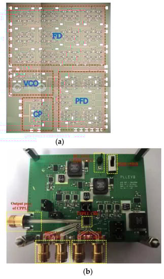 The CPPLL was realized based on the Win PL 15-12 GaAs pHEMT process. Prudent symmetrical layout techniques are used to reduce the phase noise. A micrograph of the proposed CPPLL chip is shown in Figure 10a, and the chip area without PAD is 2.7 mm × 3.4 mm. In order to facilitate the test, the CPPLL test board was manufactured and a photo is shown in Figure 10b. The voltage required by the DC PAD is supplied by the low-voltage differential linear regulator LDO.