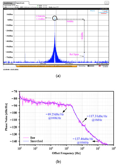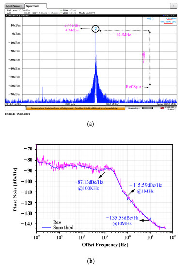 The test result shows that the operating frequency of the CPPLL is 3.584 to 4.021 GHz, and the bandwidth is about 0.44 GHz. Figure 11a shows the frequency spectrum when the output signal frequency is 3.584 GHz. The reference frequency is 56 MHz and the reference spur is −62 dBc. From the frequency spectrum and spurious signals it can be seen that the proposed CPPLL is locked. Figure 11b shows the phase noise when the output signal frequency is 3.584 GHz. The phase noise at a frequency offset of 100 kHz, 1 MHz, and 10 MHz are −89.25, −117.31, and −137.46 dBc/Hz. Figure 12a shows the frequency spectrum when the output signal frequency is 4.021 GHz. The output signal power is 4.34 dBm, the reference frequency is 62.5 MHz, and the reference spur is −64 dBc; the CPPLL is also locked. Figure 12b shows the phase noise when the output signal frequency is 4.021 GHz. The phase noise at a frequency offset of 100 kHz, 1 MHz, and 10 MHz are −87.13, −115.59, and −135.53 dBc/Hz. Figure 13 shows the phase noise and output power when the output signal frequency is 3.584 GHz to 4.021 GHz. The minimum phase noise when the frequency offset is 1 MHz is −117.82 dBc/Hz and the maximum output power is 4.34 dBm.
