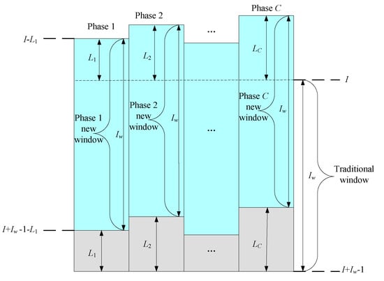 In the traditional method [], the window constructed in each operation phase is from the I batch to the I + − 1 batch and, for all phases, the length of the window is the same, so the modeling data of phase c are ( × J × K), c = 1, 2, …, C. While, for the proposed method, the maximum number of correlation batches of the current window, Lc, is obtained according to R2 in each phase to form new modeling data, which will be different for different phases. For example, within phase 1, L1 batches are pushed forward in the window, then the start batch of phase 1 window is I − L1 and the end batch is I + − 1 − L1, forming the data matrix ( × J × K1), where K1 is the number of sample points of phase 1. For phase c, the start batch is I − Lc and the end batch is I + − 1 − Lc, forming the data matrix ( × J × Kc), where Kc is the number of sample points of phase c. Finally, the C phases windows are combined to form new modeling data ( × J × K). Each time slice of ( × J × K), ( × J), is regressed with the quality to obtain the regression coefficient, and then the batch quality can be predicted by applying the PLS method.