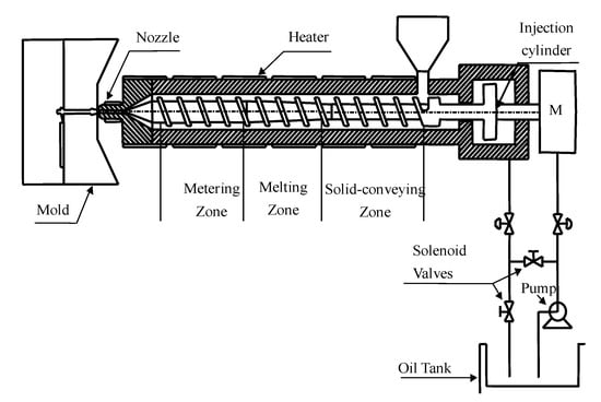A schematic diagram of the injection molding machine is shown in Figure 3. A general injection molding machine mainly comprises an injection system, a mold locking system, a hydraulic control system, and an electrical control system. The injection system has the main functions of plasticizing and fusing polymer granules or powder in the cylinder into polymer melt in the front of the cylinder, injecting the melt into the mold cavity at high pressure and high speed, and providing holding pressure in the subsequent packing-holding phase to make the polymer enter the mold cavity continuously to fill the shrinkage caused by cooling. The mold locking system has the function of opening or locking the mold by moving the movable mold plate to open or close the mold. The hydraulic system is an oil circuit supply and circulation system of the injection molding machine and provides pressure and speed loops for each actuating mechanism of the injection molding machine. The electric control system is responsible for various programs of the injection molding machine, and mainly controls various actions of the injection molding machine and various process variables of the injection molding process, including time, position, pressure, velocity, and the like.