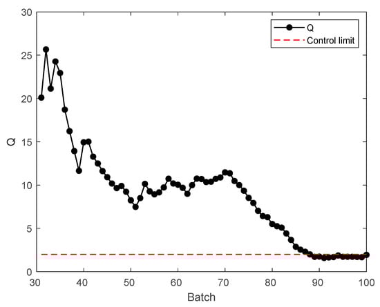 Compared with successive industrial processes, the process characteristics of batch production are more complex. Batch process data usually form a three-dimensional matrix. In order to effectively utilize the unique advantages of multivariate statistical methods in processing high-dimensional and highly coupled data, it is necessary to extend multivariate statistical process modeling methods to batch processes according to the data characteristics of batch processes. Multiway PCA (MPCA) and multiway PLS (MPLS) were first applied to batch processes by Nomikos and MacGregor [,], which led to a series of upsurges in research based on multiway statistical analysis. Many international research groups have invested a lot of manpower and material resources to carry out the research work for batch processes. The latest research applied various methods to the quality prediction and fault detection of batch processes, such as multi-mode batch process fault detection based on statistical difference LPP [], and the fault detection of multiphase batch processes based on SVDD [].