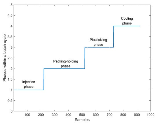 According to the change of process correlation, a batch of injection molding process is divided into four main operation phases by using a phase division method, which are the injection phase, packing-holding phase, plasticizing phase, and cooling phase. Each phase has similar process characteristics. Therefore, process characteristics are stable in the same phase. The phase division method basically corresponds to the knowledge of the batch process. For complex and unfamiliar batch processes, the phase division method can utilize process knowledge more effectively and promote the understanding of industrial process.