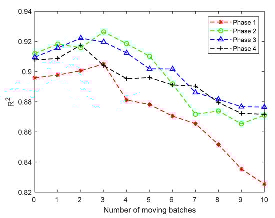 Recently, the impact of the previous batches on the quality of the current batch has excited the attention of researchers. In the traditional methods, only the process data within the current batch is responsible for the quality of this batch []. However, it has been found that some phases of the batch before the current batch may have a greater impact on the final quality of the current batch than the phases of the current batch, which should be considered in the regression modeling. Based on this find, Zou [] established multiple sliding window models in the batch direction for quality prediction of the injection molding process. In their work, based on the process knowledge that the plasticizing phase should have a bigger influence on the next batch than the current batch, the plasticizing phase was moved down by one batch when establishing the regression model; that is, in order to build the regression model of the current batch, the relationship between the process variables of the plasticizing phase of the previous batch and the final quality of the current batch was analyzed. Compared with the traditional method, their method improved the accuracy for quality prediction. However, obviously, this kind of movement is based on the process knowledge and the impact is arbitrary to some degree. In most cases, it may not be enough to consider moving the concerned phase by only one batch.