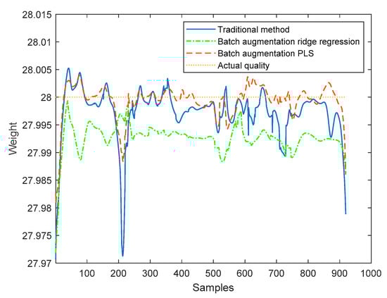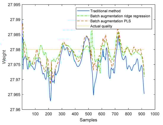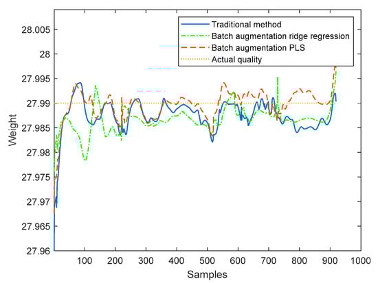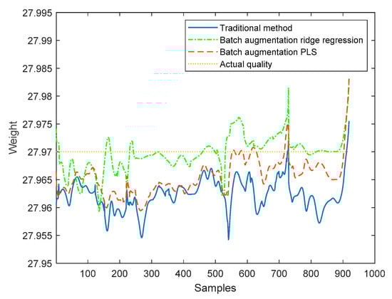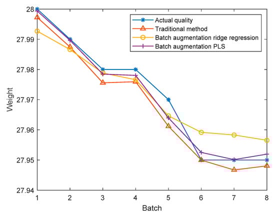 In order to further verify the effectiveness of the method, eight test batches are randomly selected in mode 1, and the quality prediction of each test batch is carried out in the corresponding window model. The traditional method, batch augmentation PLS, and batch augmentation ridge regression method are used to predict the quality, and the average value of the predicted quality of each test batch is obtained as the final quality prediction. The results are shown in Figure 13. The RMSE is calculated from the predicted results of each batch of test data and the final actual quality. The RMSE values are shown in Table 6. According to the above table, the RMSE obtained by the traditional method is 0.0042 and the RMSE obtained by the batch augmentation ridge regression is 0.0061, while the RMSE obtained by the batch augmentation PLS is 0.0026. The RMSE of the batch augmentation PLS modeling method is the smallest. Therefore, it can be concluded that the quality prediction method based on batch augmentation PLS has higher prediction accuracy than those based on the traditional PLS and the batch augmentation ridge regression in offline state.