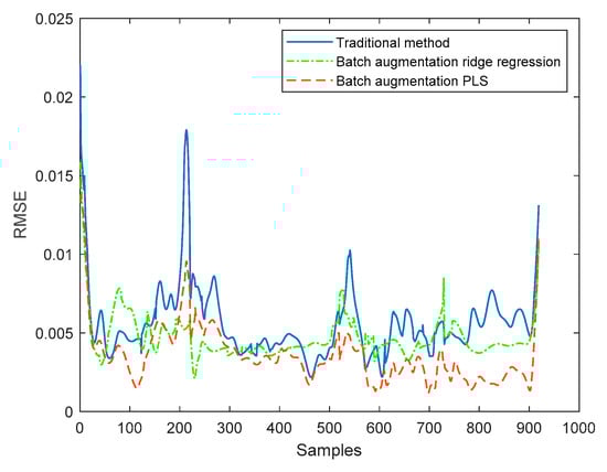 Then, the online average RMSE values of the four test batches are calculated for the three methods, respectively, and the results are shown in Figure 12. The overall RMSE average values obtained are shown in Table 5. According to Table 5, the RMSE obtained by the traditional method is 0.0056, and the RMSE obtained by the batch augmentation ridge regression method is 0.0047, while the RMSE obtained by the batch augmentation PLS method is 0.0036. It can be seen that the overall RMSE of the PLS modeling method based on batch augmentation analysis is smaller than those of the batch augmentation ridge regression and the traditional method, indicating that this method has the best prediction effect.