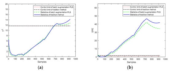 In addition, there are many kinds of faults in batch processing, and the influence of faults on the model needs to be considered. For the problem of faults from external sources, the monitoring process is added to determine if a fault does not match the current model. It is necessary to identify if the process data belong to any other normal process and, if it belongs to a normal process, apply the process model to predict the quality; otherwise, a process fault is identified and an alarm should be raised. To illustrate this situation, an external input fault is artificially added to a test batch, the input temperature is increased by 5 °C after the 100th sampling point, and the current batch is monitored. The monitoring effect of the fault batch is shown in Figure 14. It can be seen from the figure that T2 and SPE of the fault batch are beyond the control limits. This shows that both the traditional method and the batch augmentation PLS modeling model can monitor the fault batch well. Especially for SPE statistics, when an error occurs at the 100th sampling point, SPE can quickly monitor it and generate an alarm. After testing other process models, the data do not belong to any normal process. Thus, no quality prediction will be carried out for this batch and an alarm will be raised.