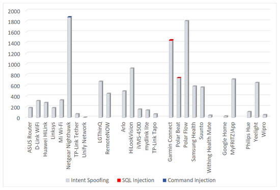 - Junior, D.M.; Melo, L.; Lu, H.; d’Amorim, M.; Prakash, A. A Study of Vulnerability Analysis of Popular Smart Devices Through Their Companion Apps. In Proceedings of the 2019 IEEE Security and Privacy Workshops, SP Workshops 2019, San Francisco, CA, USA, 19–23 May 2019; IEEE: Piscataway, NJ, USA, 2019; pp. 181–186. [Google Scholar] [CrossRef]
