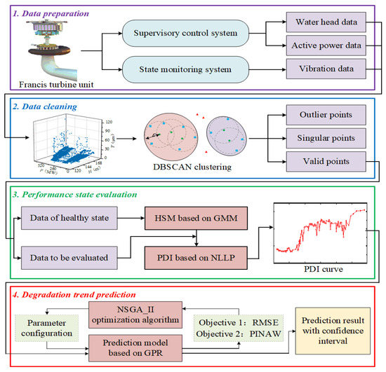 With the optimization of global energy structure, hydropower has been vigorously developed [1]. As critical equipment of hydropower utilization, it is important to ensure the safe and stable operation of Francis turbine units (FTUs) [2]. In order to transform the service mode of the FTUs from traditional schedule-based maintenance to state-based maintenance, the prognostic of FTUs has received more and more attention [3]. There are two main parts in the prognostic of FTUs, including performance state evaluation and degradation trend prediction [4]. Based on this, the current and future states of FTUs can be determined so as to formulate a targeted maintenance strategy. However, in practical engineering environments, there are three significant difficulties, including low data quality, complex variable operation conditions, and prediction model parameter optimization.