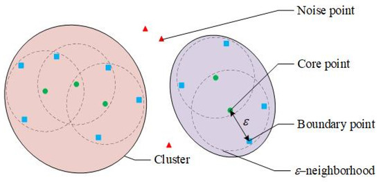 To solve the data anomaly in the raw running sample set, a data cleaning approach based on DBSCAN is proposed. Traditional statistics-based methods such as the 3-sigma principle are effective in detecting singular points, but they can hardly identify outliers whose value is within the normal range [31]. DBSCAN clustering algorithm has the advantages of high adaptability, extensible dimension, and applicability to arbitrary data shape [32]. It can automatically identify the singularities and outliers in the multi-dimensional data set. Its schematic diagram is shown in Figure 2, and the main steps are as follows [33]: