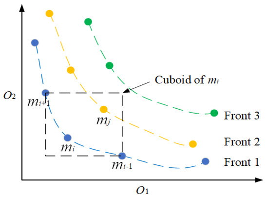 NSGA-II makes excellent improvements on NSGA, and it has faster computational efficiency and population diversity [37]. There are two basic concepts in NSGA-II: non-dominated sorting and crowding distance. The procedure of non-dominated sorting begins with the identification of non-dominated solutions. As shown in Figure 3, for two members and , if all the objectives of are better than , is defined to dominate . Then, the members which are not dominated by others constitute the current front. Next, the members of the current front are removed, and the sorting is performed on the remained population. The procedure is repeated until all the members are distributed to different fronts.