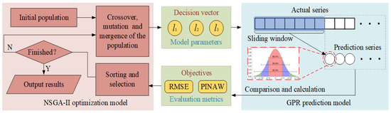 These kernel functions all contain a length scale . To improve the performance of the model, the common approach is to adjust manually, which is less efficient. Aiming at this problem, the NSGA-II algorithm is introduced to automatically optimize the GPR model. Since GPR outputs the PDD of predicted values, quantiles and confidence intervals (CIs) can be calculated directly. Interval prediction results are usually evaluated by multiple criteria, including the root-mean-square error (RMSE), which reflects the accuracy, and the prediction interval normalized average (PINAW), which reflects certainty, defined as: