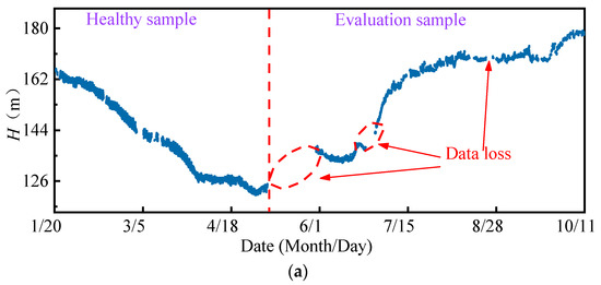 The studied FTU is located in the Dadu River basin, Sichuan, China. Its basic parameters are listed in Table 1. A set of PSTA-2100 state monitoring systems, including on-site monitoring cabinet and upper computer system, is configured on the FTU. The on-site monitoring cabinet is formed by a sensor power module, data acquisition module, synchronous clock module, and industry cabinet. It is located near the FTU. The top cover vibration (V) is monitored by the acceleration sensor (PCB 352A60). The water head (H) and the active power (P) are obtained through communication with the supervisory control system of the plant following the modbus 485 protocol. The collected data are transmitted to the upper computer through the communication link following TCP/IP protocol. The actual length of the communication link, which consists of optical cables, switches, routers, repeaters, and transceivers, is above 1000 m. The analyzed sample set (H, P, V) is constructed by the data records exported from the upper computer. The overall structure of the FTU and the data acquisition system are illustrated in Figure 6. To sum up, the data acquisition process involves a series of devices and processes, which are prone to data loss and data abnormality.
