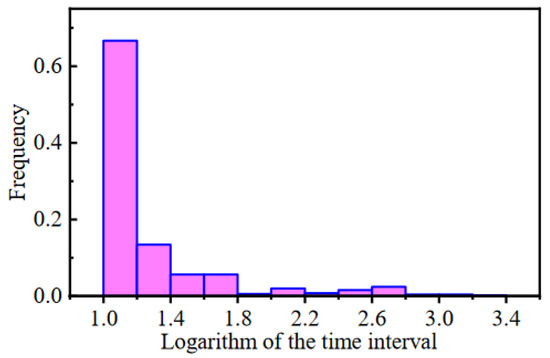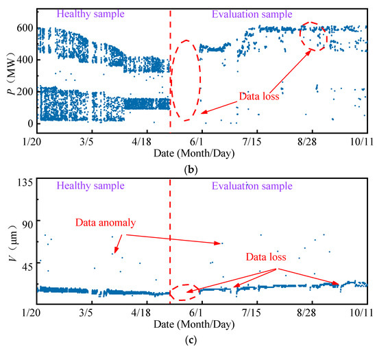 The exported data includes 104,454 historical records from 20 January 2019 to 11 October 2019 for a total of 264 days, as shown in Figure 7. The on-site dataset is quite different from the high-quality data obtained in the ideal experimental environment, such as the bearing life cycle dataset published by the Center for Intelligent Maintenance Systems, University of Cincinnati [38]. Most experimental data sets are less disturbed by external interference and have stable sampling frequency. However, it can be seen that the data loss and data anomaly are very obvious in the raw on-site data set. Data loss leads to unequal time stamps of samples. As shown in Figure 8, the time intervals between adjacent samples ranged from 10 s to 103 s, which makes it difficult to analyze the frequency domain features of signals. In addition, because of the task of grid regulation and seasonal changes in the water head, the operation condition parameters of the FTU change frequently and drastically. Low data quality and variable operation conditions greatly influence the performance state evaluation and degradation trend prediction of the FTU.