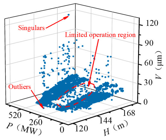 Due to their task of regulating the power grid, the operation condition parameters of FTUs change more frequently than other kinds of rotating machines. Therefore, unlike most traditional methods, operation condition parameters are taken into full consideration in the performance state evaluation in this study. The major operation condition parameters of FTUs include rotation speed (n), water head (H), active power (P), flow rate (Q), guide vanes opening degree (α), etc. Since the duration of transient operation conditions is particularly short compared with the total working time of FTUs, only steady operation conditions are considered in this research. So n can be considered equal to the rated value of the FTU. For a specific FTU, there is a certain relationship between H, P, Q, and α. If two of them are identified, others can be inquired from the comprehensive operation curve of the FTU [30]. Thus H and P are chosen as the studied operation condition parameters. As a critical component of the FTU, the top cover is used to seal the runner and support the main shaft. Its vibration amplitude (V) can reflect the performance state of the FTU. In conclusion, the running sample set of the FTU is formed by (H, P, V), including both operation condition parameters and monitoring data.