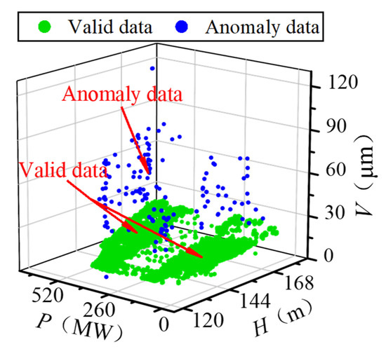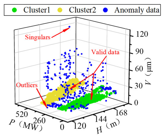 The raw running sample set (H, P, V) is exhibited in Figure 9. Due to the characteristic of the FTU, there is a specific limited operation region within the operating conditions. In the limited area, the stability and efficiency of the FTU decrease. In practice, the FTU is avoided from working in the limited area, so the sample points are concentrated in two regions. Because of various interference factors, the data anomaly is very obvious in the raw data set. The data anomaly mainly includes singular points whose values deviate significantly from the normal level and outliers whose values are within the normal scope, but their distribution deviates from the valid samples. To reduce the impact of data anomaly, DBSCAN was adopted to identify the singulars and outliers in the original sample set. The and M were set as 7.5 and 200, respectively. The processing result is shown in Figure 10. The two sample concentrated regions are marked as cluster 1 and cluster 2. Singulars and outliers are both marked as anomaly data automatically. Since the DBSCAN considers the distribution density of samples rather than the value of data, it performs well in identifying both outliers and singularities in the low-quality data set.