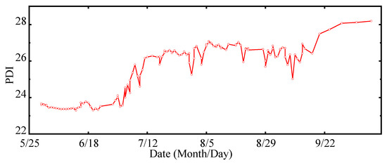 The valid data after 6 May 2019 were selected to construct the evaluation sample set. All 300 evaluation samples were input into the HSM as a group to calculate the PDIs. The timestamp corresponding to the last evaluation sample in each group was taken as the evaluation time. The obtained performance degradation curve, including 135 PDIs, is demonstrated in Figure 12. Although the PDI curve fluctuates locally due to low data quality, the curve has an obvious upward trend reflecting the performance degradation process of the FTU.