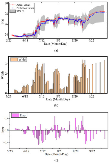 where indicates whether the observed value is within the predicted CI. A higher PICP indicates the interval prediction result is more accurate.