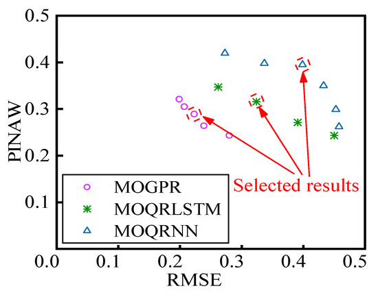 The Pareto fronts of optimization results of MOGPR, MOQRLSTM, and MOQRNN are illustrated in Figure 17. The results of MOGPR are generally closer to the origin. The lowest PINAW values reached by the 3 models are similar (about 0.243~0.271), while the lowest RMSE value obtained by MOGPR (about 0.199) is smaller than MOQRLSTM’s (about 0.262) and MOQRNN’s (about 0.273). As two independent optimization objectives, RMSE and PINAW have the same dimension of quantity and similar value range. In this study, the importance of the two objectives is considered equal. So the result closest to the origin in the Pareto front is selected as the final result of three multiobjective optimization prediction models.