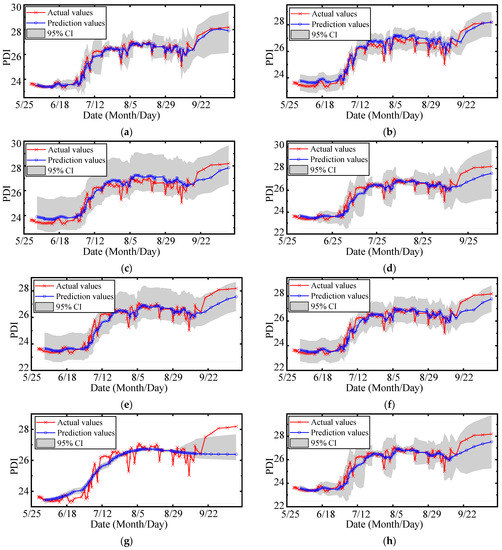 - The RMSE and the MAPE of MOGPR are the lowest (0.223 and 0.641%), and the R2_score of MOGPR is the highest (0.974). As shown in Figure 18a, MOGPR has a good prediction effect on both long-term trends and local fluctuation of the PDI curve. It proves that the prediction accuracy of MOGPR is the best.