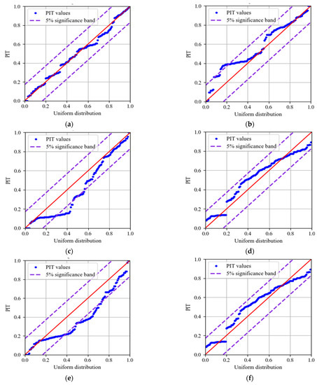 where is the prediction distribution and is the observed value. If the distribution of PIT values is similar to the uniform distribution, the prediction reliability is better.