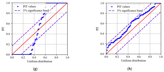 - As shown in Figure 19, the PIT values’ distribution of MOGPR is closest to the uniform distribution, which is displayed as the red diagonal in the QQ plot. In addition, all PIT points are located within the 5% significance band, which indicates that the prediction CI of MOGPR is reliable. The PITs of the LWLR distribute around 0 or 1, which indicates that the LWLR is most unsuitable for interval prediction of PDI compared with other models.