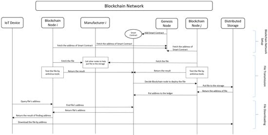 The system deploys smart contracts through the genesis node and obtains contract locations from other nodes. Then, the manufacturer node that wants to release the firmware update file initiates the transaction, and the file is transmitted to other nodes for verification. After the verification, the file is stored into the distributed database, and the file information is saved in the ledger for other nodes to query. The IoT device sends a query request through the blockchain node and downloads the update file according to the query result to complete the secure updating. The following subsections will describe the three phases of the proposed system, including the blockchain network setup, file transmission, and file downloading.