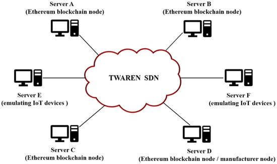 The experimental evaluation environment is shown in Figure 6. In the experimental environment, we have constructed the system with the four servers, A, B, C, and D, selected to be the Ethereum blockchain nodes in a private network over the TWAREN (TaiWan Advanced Research and Education Network) SDN (Software Defined Network) environment. Servers A, B, C, and D are deployed in different physical locations, and each of them is equipped with 16-cores Intel Xeon E5630 @ 2.53 GHz and 16 GB RAM, running the Ubuntu 18.04 LTS. Server D is simulated as a manufacturer node that has different sizes of firmware update files ranging from 31.8K to 5.6M. To emulate the IoT devices environment, we built a Raspberry Pi QEMU image running on servers E and F equipped with 16-cores Intel Xeon E5620 @ 2.4 GHz and 72 GB RAM. We enable the docker service in QEMU for the benchmark setup. A dockerized version of ApacheBench benchmarking tool from “https://hub.docker.com/r/adamoss/rpi-apachebench/” (accessed on 15 October 2021) is used to measure the performance of the proposed system, where ApacheBench is a tool for benchmarking an Apache HTTP (HyperText Transfer Protocol) server, showing how many requests per second the Apache installation is capable of serving. Although ApacheBench is originally designed to test the Apache HTTP server, it is generic enough to test any web server. Moreover, we use Swarm as our firmware storage system, where Swarm package is a distributed storage protocol and content distribution service in Ethereum. And the smart contracts used in the proposed mechanism are developed by Solidity program language.