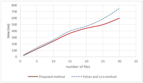 The following will explain and compare the experimental results with other methods in terms of firmware uploading. In this evaluation, we compare the firmware uploading and evaluate the system efficiency by the number of uploaded firmware files received at the same time. Since Yohan and Lo [] have compared the efficiency of their scheme with Lee and Lee’s [] and Boudguiga et al.’s schemes [] and confirmed that it is superior to the other two in terms of efficiency, we will focus on comparing with Yohan and Lo’s scheme [].
