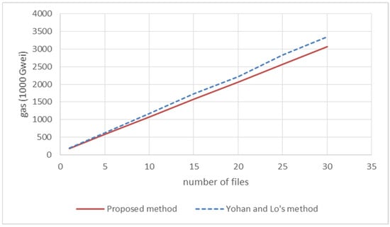 The items listed in Table 1 include gas cost, timestamp, block number, and the number of firmware files. “Gas cost” represents the total price of the experiment, where the price unit is Gwei and 1 Gwei is equal to Eth. When the number of uploaded firmware files is 30, the total price of firmware uploading is equal to 3,061,073 × 10−9 Eth. “Timestamp” represents the timestamp of the block generation, from which the time for generating each block can be inferred. By combining the data of each field, we can know the execution time and gas cost, as shown in Figure 7 and Figure 8, where the blue dotted line represents the method of Yohan and Lo [], and the red solid line represents the proposed method.